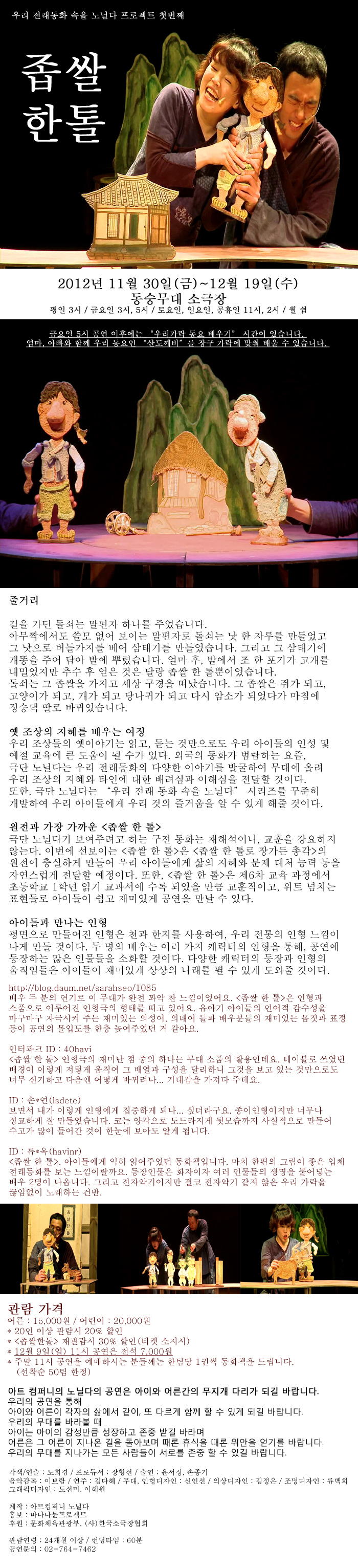| 제작 | 제작: 아트컴퍼니 노닐다/후원: 문화체육관광부, (사)한국소극장협회 |