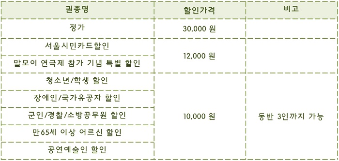 | 공연시간 | 화수금 19:30 / 토 15:00 18:00 / 일 15:00 / 월,목 공연 없음 | ||||||||||||||||||||||||||||||||||||||||||||||||||||||