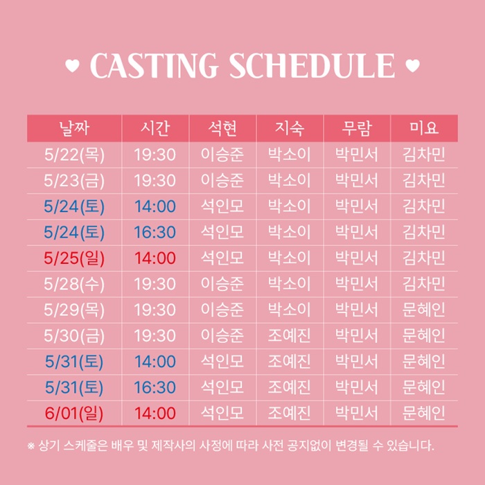 | 공연시간 | 수목금 19:30 / 토 14:00 16:30 / 일 14:00 (월화 공연없음) | ||||||||||||||||||||||||||||||||||||||||||||||||||||||