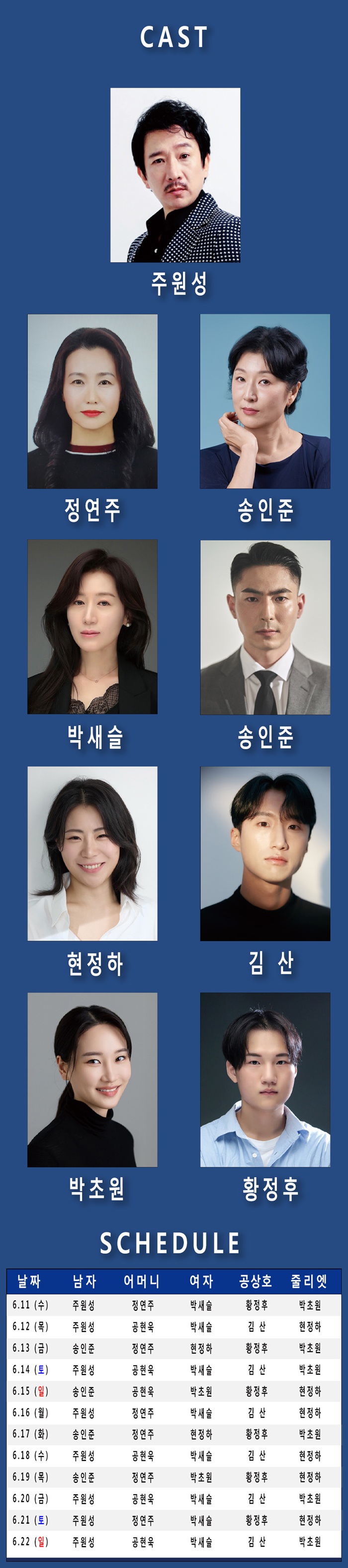 | 출연자 | 주원성, 정연주, 공현욱, 박새슬, 송인준, 현정하, 김산, 박초원, 황정후, 이세빈 | ||||||||||||||||||||||||||||||||||||||||||||||||||||||