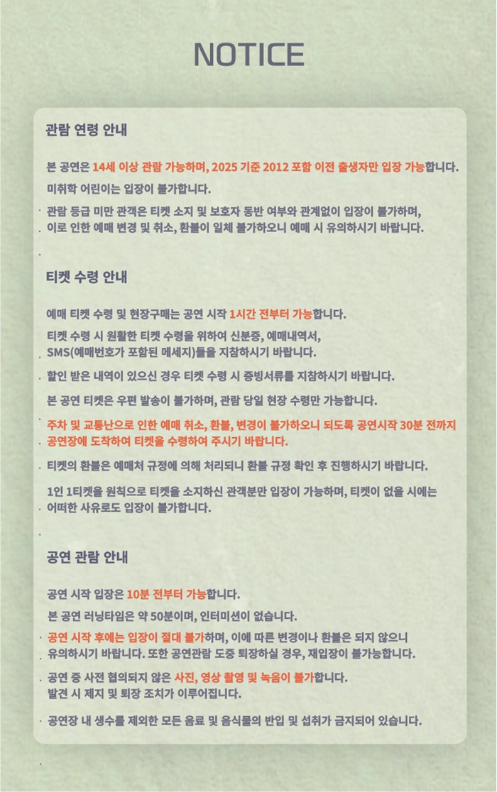| 공연일자 | 2025-10-08(수) ~ 2025-10-14(화) | ||||||||||||||||||||||||||||||||||||||||||||||||||||||