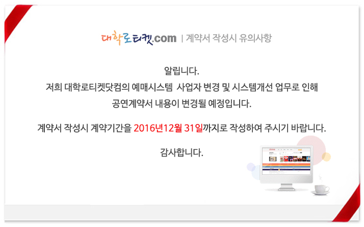 | 80 | [공지안내]대학로티켓닷컴 시스템업체 변경에 따른 운... | 최고 관리자 | 2017-02-03 | 1408 | |