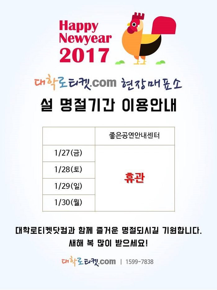 | 75 | 대학로티켓닷컴 현장매표소 추석 명절기간 이용안내 | 최고 관리자 | 2016-09-07 | 1392 | |
