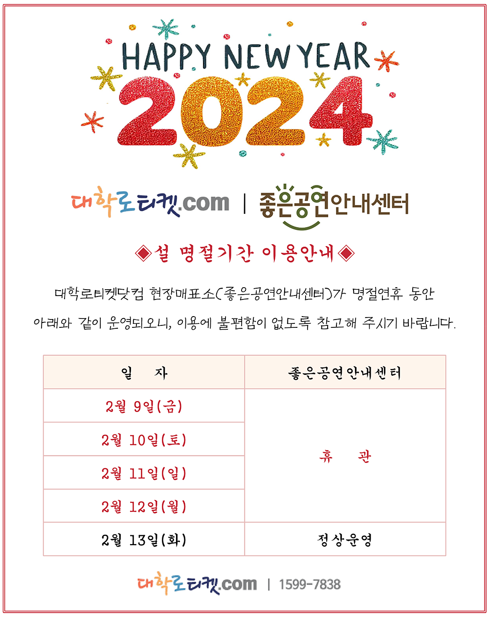 [공지안내] 2024 설 명절기간 좋은공연안내센터 이용안내