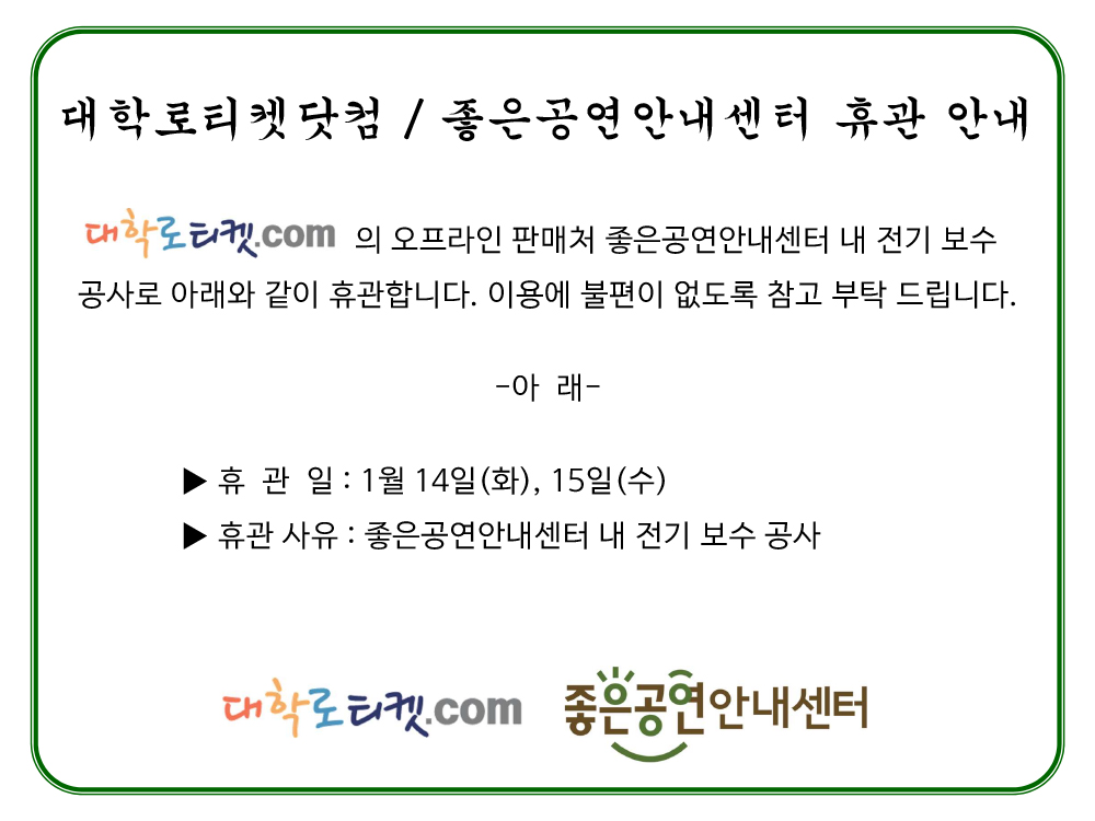 [공지안내]좋은공연안내센터 휴관안내(센터 내 전기 공사)