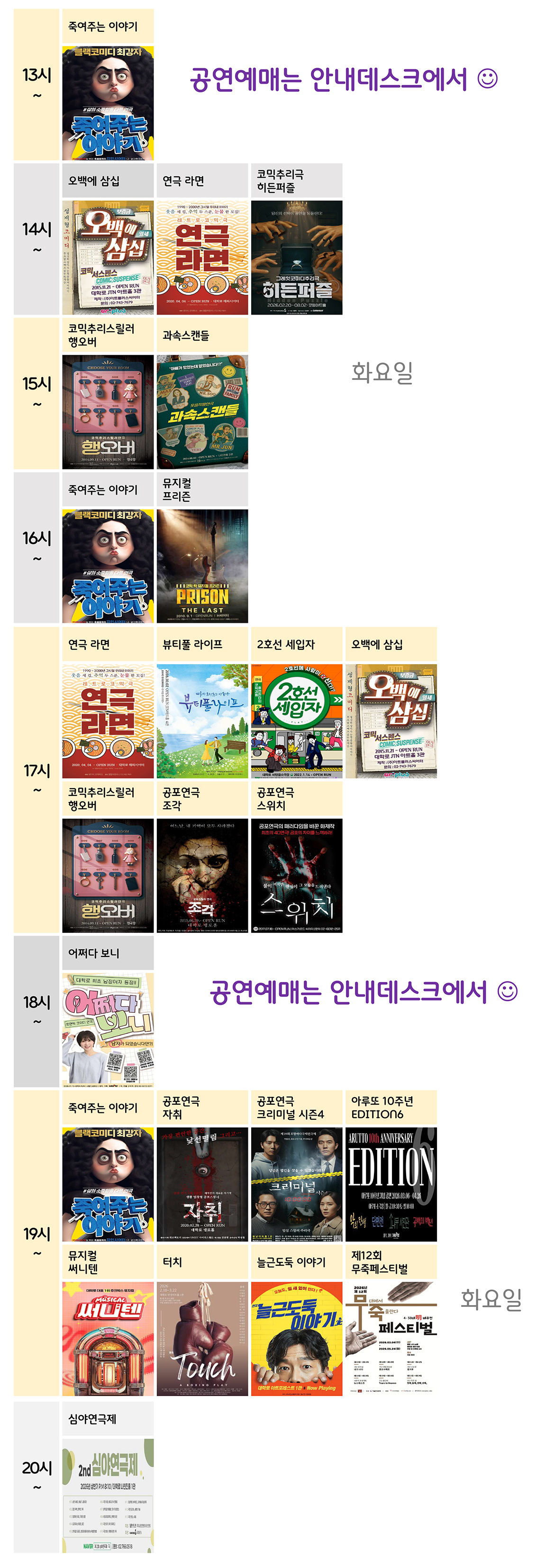 | 116 | 오늘의 공연[3월/일요일] | 최고 관리자 | 2025-09-19 | 390 | |