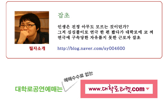 | 1 | [그림에세이_혜화동노트] 01. 연극<짬뽕> | 최고 관리자 | 2012-06-14 | 1682 |