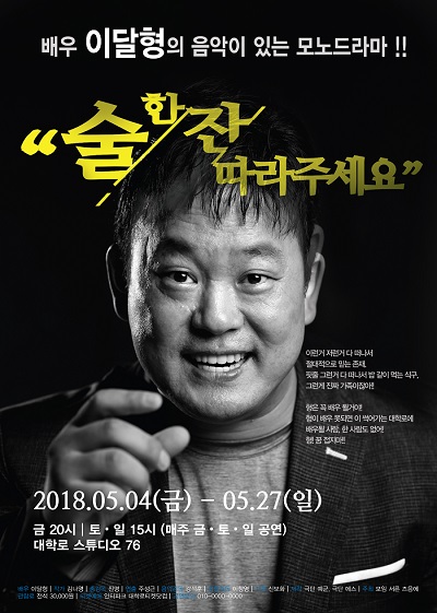 배우 이달형의 음악이 있는 모노드라마 "술 한 잔 따라주세요" 는 2018년 5월 4일(금)부터 대학로 스튜디오76 극장에서 시작된다.