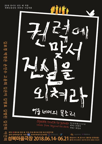 세계인권선언 70주년을 맞아 극단 종이로 만든 배에서 <권력에 맞서 진실을 외쳐라!-부제: 어둠 너머의 목소리>를 무대에 올린다. 대작가 ‘아리엘 도르프만’이 5대륙 35개 나라의 인권운동가들을 인터뷰한 케리 케네디의 역동적인 책 “진실을 외쳐라 – 세상을 바꿔가는 인권운동가들”을 희곡화한 작품이다. 알려지지 않은 인권운동가들의 목소리에 빛을 비춘다. 폭력적인 권력에 굴하지 않고, 어둠 속에서도 자신의 목소리를 지켜온 인권운동가들에 대한 이야기를 소개하고, 그들의 숭고한 삶을 통해서 인간의 기본 권리인 ‘인권’의 진정한 의미를 관객들과 함께 나눠보고자 한다. 그 과정을 통해서 우리는 신자유주의적 경쟁이 첨예화된 이 사회에서 과연 ”어떻게 사는 것이 가치 있는 삶인가?, 무엇을 위해서 살아갈 것인가?” 라는 삶의 근본적인 문제를 성찰하고자 한다. 매 공연이 끝난 후에는 한국의 활동가들을 초대하여 한국인권운동의 역사와 현재를 바라보고 미래를 함께 이야기 하는 시간을 갖는다.