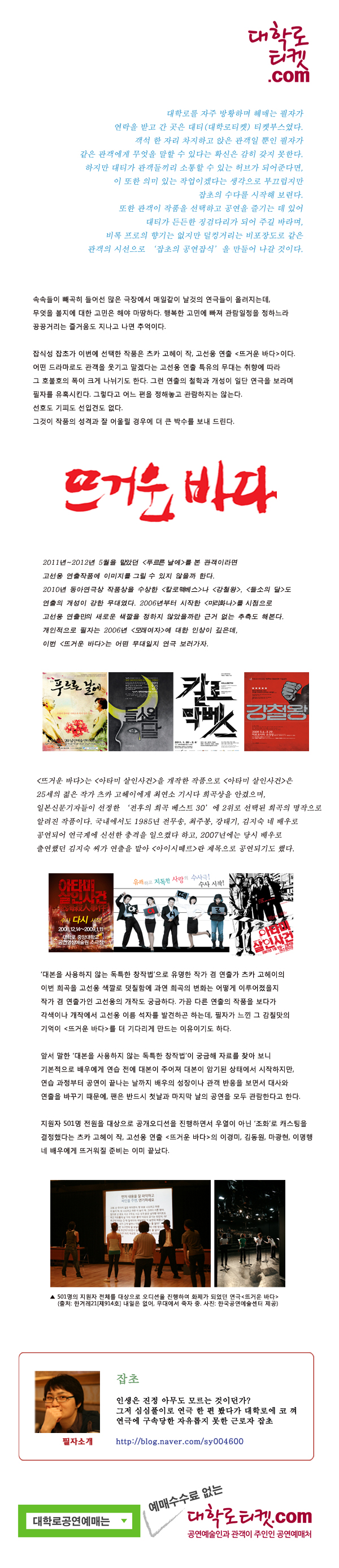 | 2 | [미리보기_잡초의 공연 잡식] 01. 연극<뜨거운 바다> | 최고 관리자 | 2012-06-14 | 1438 | |