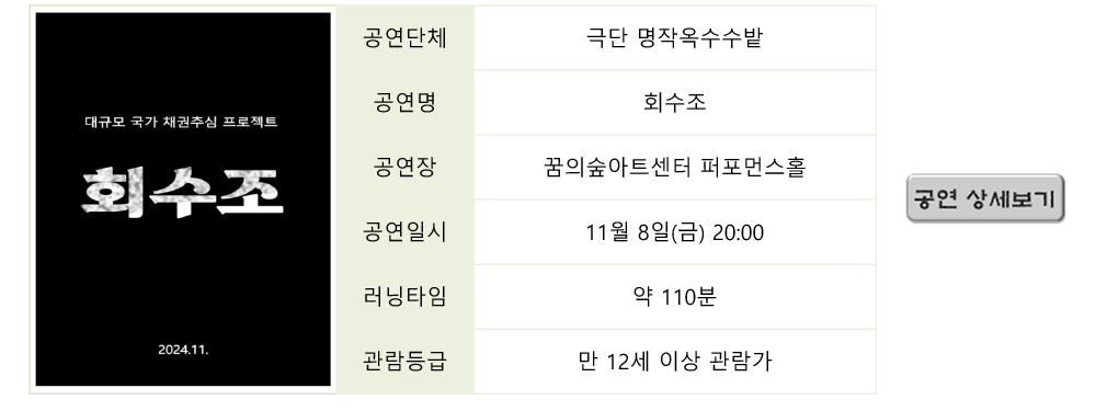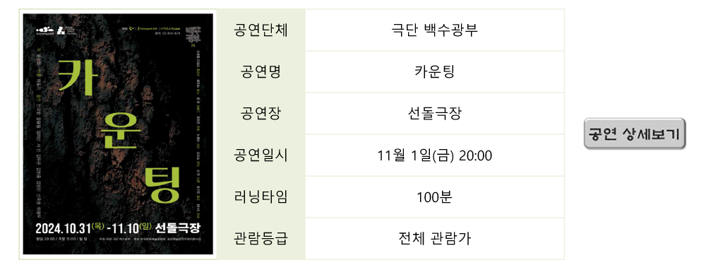| 2614 | 휴먼 코미디 연극 <보물찾기> 티켓 오픈 | 최고 관리자 | 2024-09-26 | 3345 | |