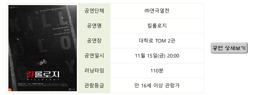 | 2615 | 스릴러 연극 <701호> 티켓 오픈 | 최고 관리자 | 2024-09-26 | 3615 | |