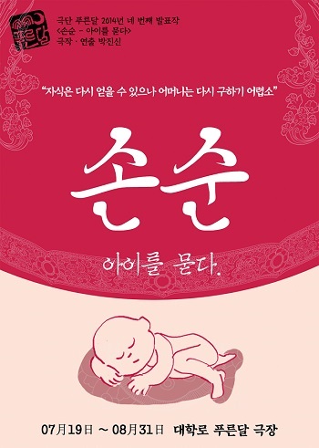 푸른달에서 이번에 발표하는 5번째 레파토리 <손순 - 아이를 묻다>는 삼국유사의 이야기를 현실에 옮겨 손순과 가족의 드라마를 간결한 무대와 붉은 끈, 독특한 언어로 재해석, 재구성 함으로서 사랑에 대한 본질과 효에 대한 본질을 묻는다.