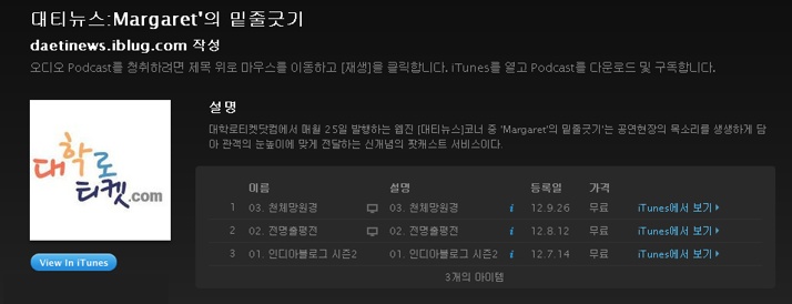 | 4 | [팟캐스트_Margaret의 밑줄긋기] 03. 천체망원경 | 최고 관리자 | 2012-06-30 | 1451 | |