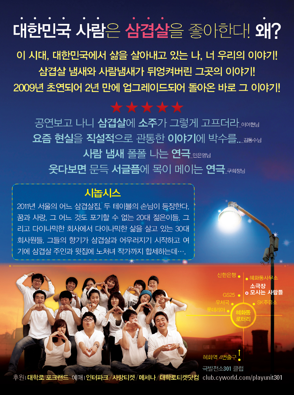 공연장르 연극(창작), 연극(코미디), [테마] 부모님과 함께 관람, [테마] 연인 또는 부부, [테마] 아직은 어색한 커플, [테마] 오랜만에 만난 친구들, [테마] 혼자 보기 좋은 공연, [추가분류] 앵콜, [추가분류] 옴니버스