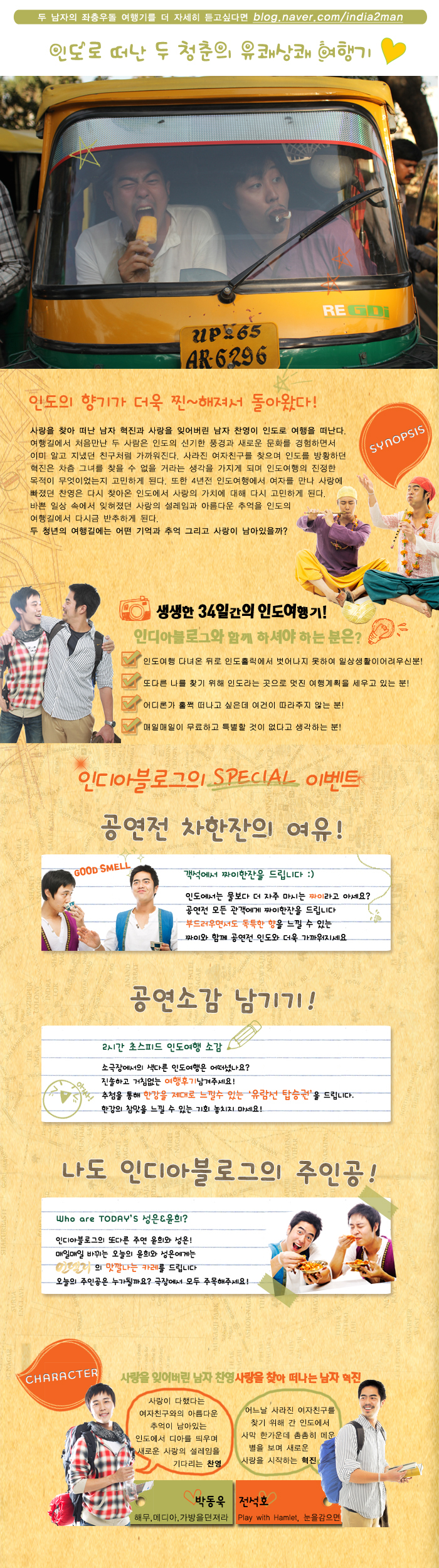 무대 위에 두 배우가 나와 있다. 극장 로비에서 인도식 밀크티 짜이를 나눠주던 혁진(전석호 分)이 인도 이야기로 공연의 시작을 알린다. “인도 여행 가보셨어요?” 찬영(박동욱 分)이 관객에게 말을 건다. 관객들은 이 연극-여행이 어디로 흘러갈지 상상하며 그들을 바라본다. 사람이 풍경 속으로 걸어가듯 관객은 무대 위의 인도 여행에 초대된다. 배우들은 무대 언어의 힘을 빼고 일상적인 대화를 나누면서 관객과 가까워지고 관객들은 구경꾼의 자리에서 벗어나 그들의 이야기에 동참한다.