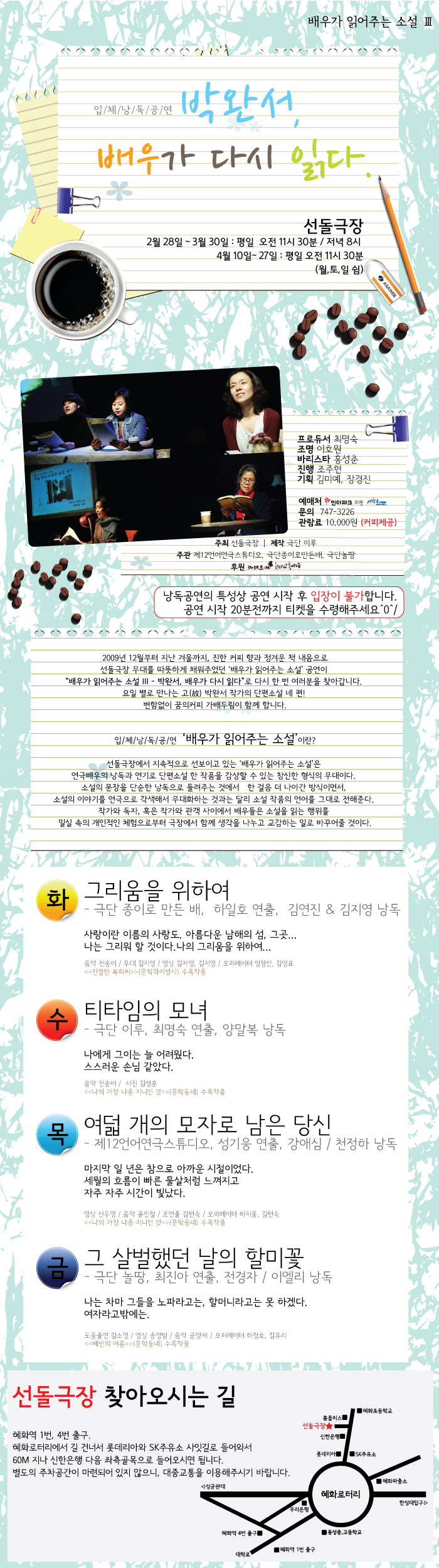 | 공연시간 | 2/28~3/30 화~금 11:30,20:00 | 4/10~4/27 화~금 11:30 (월,토,일 공연없음) |