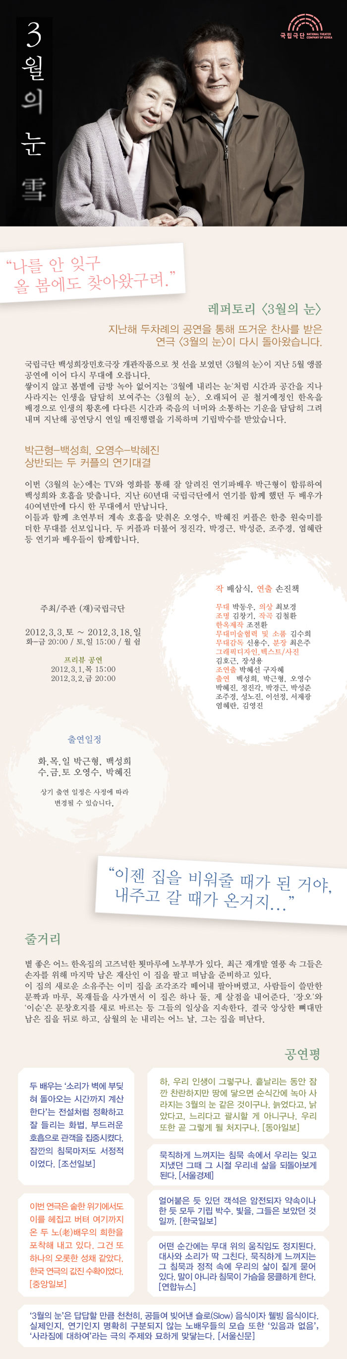 | 할인정보 | 회원할인(10%,국립극단홈페이지회원-1인2매) 기타(20%,국립극단 2011년 공연 프로그램 또는 2012년 공연<3월의 눈 포함> 유료티켓소지자-1인2매) 장애인(50%,본인에한함) |