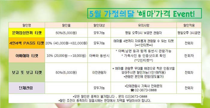 | 할인정보 | 평일낮공연(문화밥상한끼티켓) 프리티켓4(4인4색PASS티켓) 아빠와함께(아빠해마티켓) 재관람할인(보고또보고할인) |