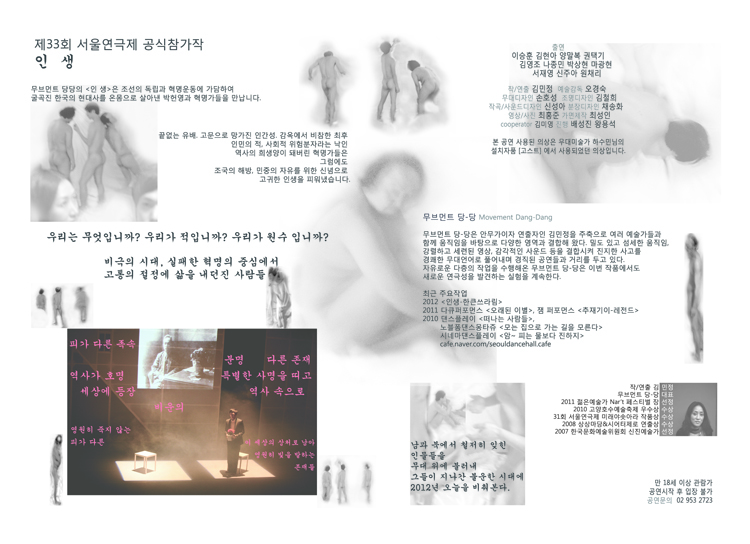 1950년대 전,후의 가장 아팠던 한국사역사속에 실존인물의 재조명이라는 암울하고 어두운 소재를 음악과 조명 그리고 분장과 의상 ,, 안무까지 자칫 무겁게 가라앉을 극적흐름에 무브먼트 당당의 색깔로 간결하고도 경쾌하게 마무리를 지어주는듯하다 |