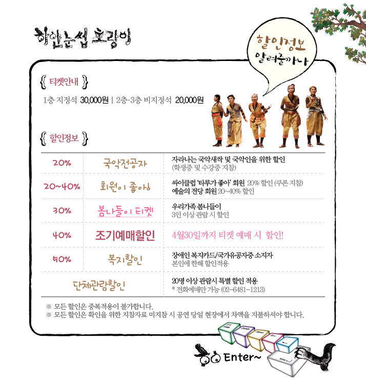 | 할인정보 | 전공자할인, 관극회원할인, 가족할인(3인이상), 조기예매(~4/30까지예매시) 복지할인(50%,본인에한함) |