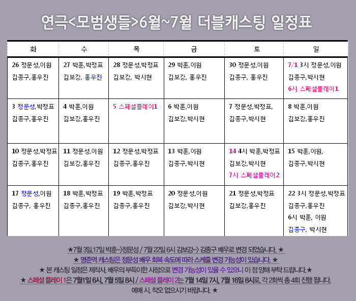 | 공연시간 | 평일 8시/토 4시,7시/일.공휴일 3시,6시/월 쉼. (단, 7/5(목) 8시, 7/14(토) 7시 공연은 매진입니다.) |