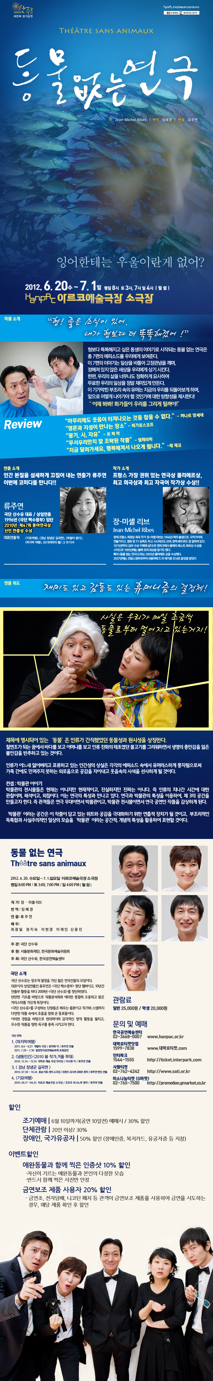 | 할인정보 | 조기예매(30%,~6/10까지) 단체관람(30%,20인이상) 장애우 및 국가유공자(50%,본인에한함) 이벤트할인(아래참조) |