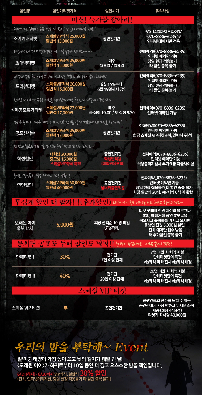 | 공연장르 | 연극(호러), 연극(스릴러), [테마] 연인 또는 부부, [테마] 퇴근 후 직장인들, [추가분류] 앵콜, [추천연령] 전체, [추천성별] 전체 |