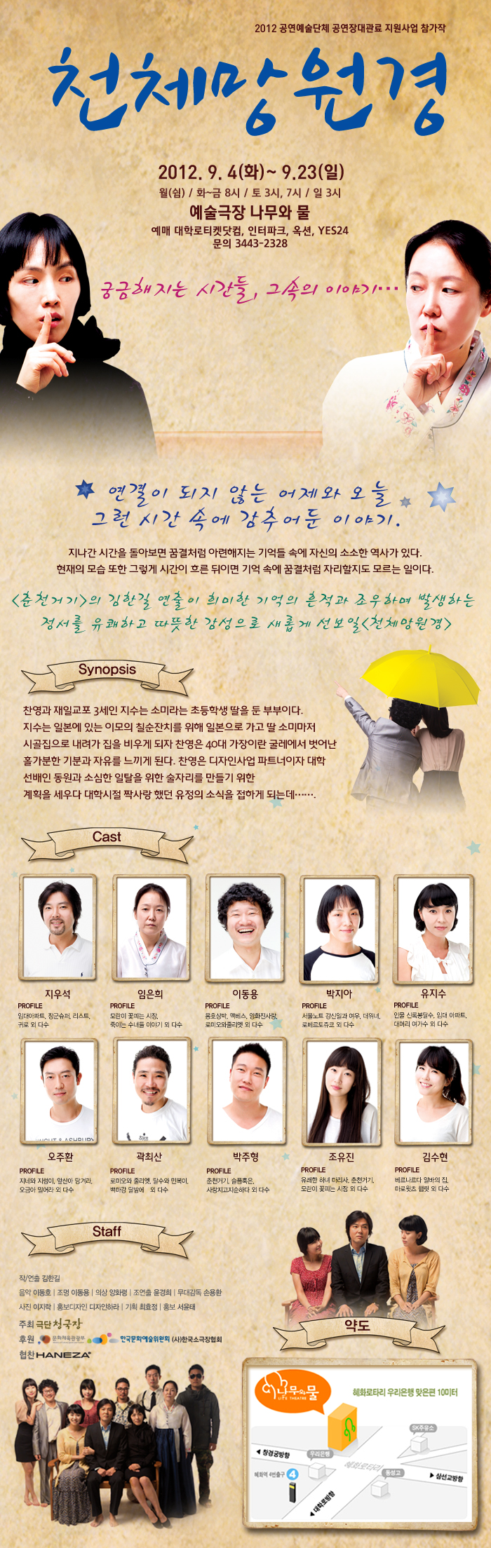 | 제작 | 주최: 극단청국장/후원: 문화체육관광부, 한국문화예술위원회, (사)한국소극장협회/협찬: HANEZA |