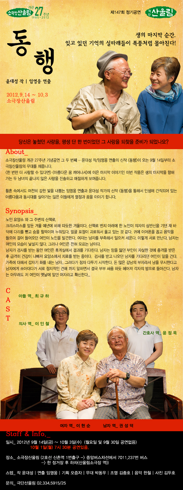 삶에 지치는 이 순간, 지금 뒤를 돌아보라. 연극 <동행> 지난 14일, 소극장 산울림 개관 27주년 기념 세 번째 무대가 열렸다. 연극의 제목은 <동행>으로, <한 번만 사랑할 수 있다면> <아름다운 꿈 깨어나서>에 이은 마지막 이야기인 이 작품은 일명 “실버 연극”으로서 노년의 두 남녀를 주인공으로 하고 있다. 최근 노년의 삶을 조명하는 작품이 다수 나오고 있어 그리 신기한 일은 아니다. 그리고 언젠가부터 불어온 복고신드롬에 따르듯 혹은 언제나 우리들 곁에 자리하고 있는 지난 젊은 시절의 향수를 자극하는 “첫사랑”이 본 작품에서도 주요 소재이다. 그러나 필자는 이 연극을 이렇게 말하고 싶다. ‘진부하지만 진부할 수 없는 연극‘ 왜냐하면 이 작품은 바로 ’사람‘과 ’삶‘을 말하기 때문이다.