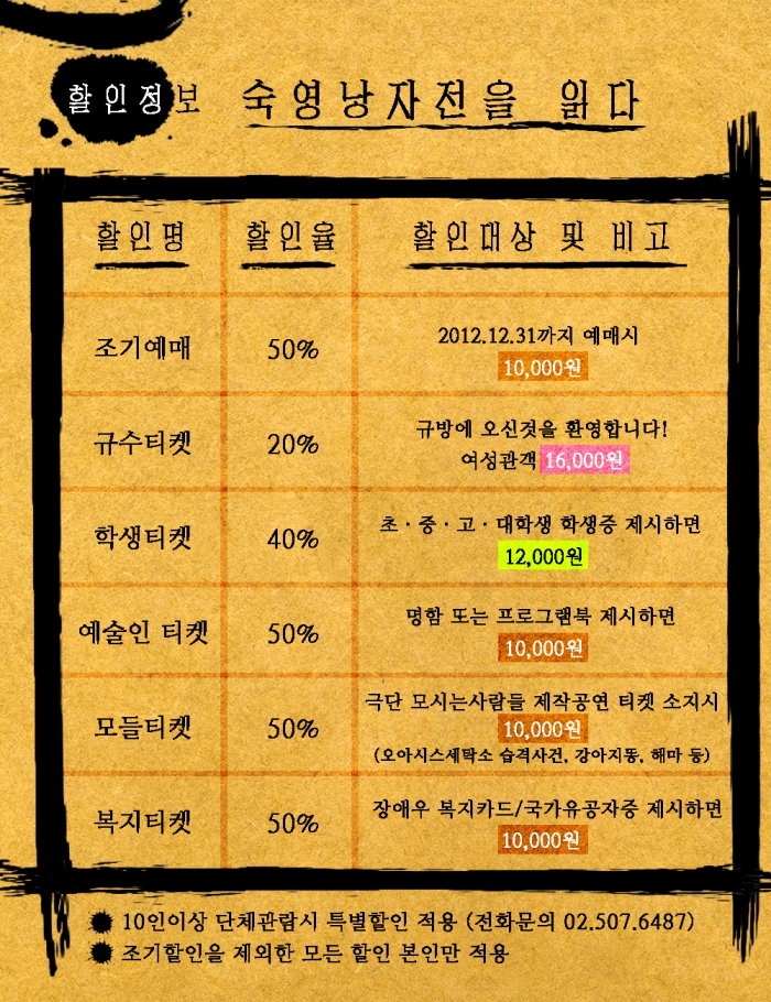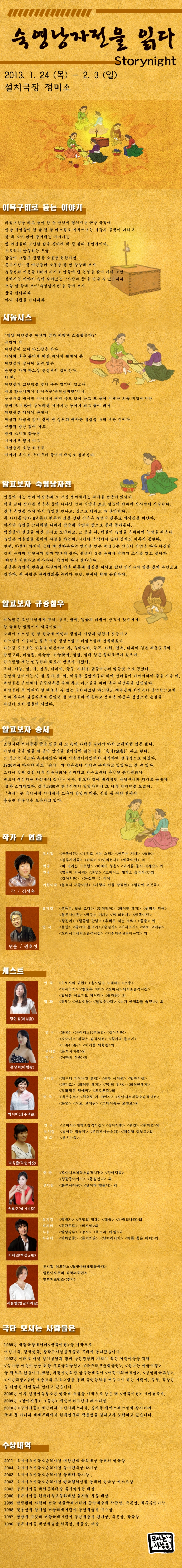 작: 김정숙 연출: 권호성 출연: 정연심, 문상희, 박지아, 박옥출, 송효주, 이재민, 서늘볕 공연일시: 2013.01.24-02.01 공연장소: 설치극장 정미소 관람일시: 2013.01.24.20:00