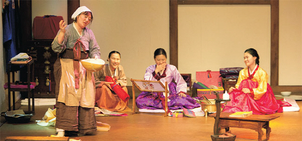 *조선시대 여인들의 규방생활 엿보기 공연의 재미가 극내용의 전개방식을 보는 것에만 있는 것은 아니었다. 이 연극은 우리나라 옛 선조 여인들의 생활상을 엿볼 수 있게도 해주었는데, 특히 조선 여인들의 ‘규방생활상’과 ‘문화생활상’을 그려볼 수 있게 해주었다. 바느질을 하고, 옷을 만들고, 옷감을 고르는 등의 가뿐한 손놀림들, 그리고 화롯대를 둘러싸고 펄럭이는 고운 색감들, 호롱불을 맴돌며 덩실거리는 춤사위와 구성지고 멋들어진 노랫가락 등은 규중을 다채롭게 장식하면서도 그 시대적 생활풍속을 화폭처럼 담아냈다. 더욱이, 쉴 줄 모르고 이어지는 아씨의 경 읽는 소리, 거기에 장단 맞추는 하녀들의 추임새와 몸짓들, 또 이에 곁들여지는 ‘백선군’의 아리따운 춤과 이미지들은 이들의 문화생활상을 시적으로 묘사해냈다. 이들의 몸짓과 가락을 함께 하다 보면, 관객들은 어느새 규중 속을 넘나드는 것 같았고, 그러면서 옛 선조들의 규방문화생활상을 음미해보는 것 같았다.