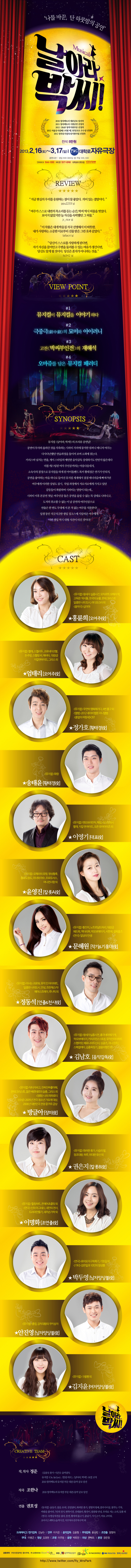 이벤트 당첨으로 정말 운이 좋게 2/16일 공연을 보게 되었는데, 뮤지컬 배우들의 꿈과 삶을 그리면서도 박씨 이야기를 잘 표현한 것 같아서 정말 만족스럽게 보았습니다. 좋은 공연 정말 감사하며 강력 추천입니다. ^^ | 김승훈 | 2013-02-17 |
