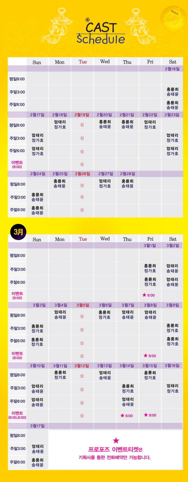 | 공연시간 | 월수목금 8시/주말 3시,6시(단,3/1,14 3시,6시 공연. 3/16 3시공연) |
