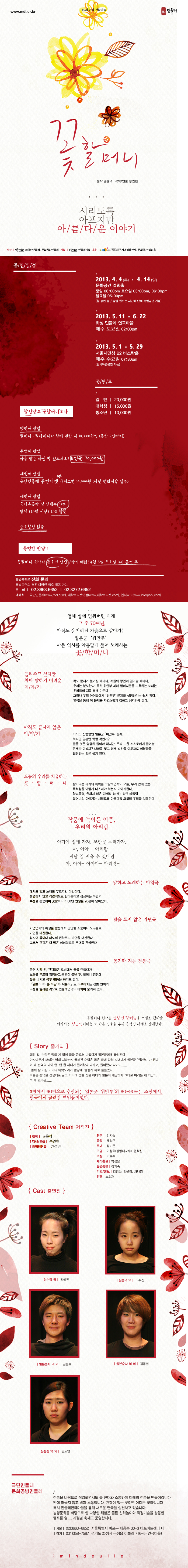 노래와 대사, 마임으로 되살아가는 위안부의 삶 일본군 종군위안부 문제는 모든 한국인의 마음속에 박혀 있는 무거운 돌 같은 것이다. 일제의 만행 중에서도 가장 비극적이고 반인륜적인 범죄로, 아직까지도 정당한 사죄와 보상이 이루어지지 않고 있는 실정이기 때문이다. 그러한 위안부 문제를 다룬 작품이다 보니 관람하러 가는 발걸음이 무거웠던 것도 사실이다. 그러나 극장의 분위기는 마냥 엄숙하지만은 않았다. 공연을 20분 정도 앞둔 로비는 마치 하얗고 붉은 종이꽃이 만발해 꽃동산처럼 꾸며져 있었다. 로비 한편으로는 관객이 직접 꽃을 만드는 코너가 준비되어 있다. 관객이 만든 꽃은 공연 중 무대 양 옆을 장식하고 있다 공연이 끝나고 관객이 손수 할머니 영정에 헌화하도록 되어 있다. 이는 『길놀이▷본 마당▷뒤풀이』 순으로 이어지는 전통 연희의 구성을 빌려온 것으로, 전통과 현대를 잇는 극단 민들레의 연극 미학이 숨어 있다. 작품은 단 네 명의 배우들의 연기로 이루어지며, 무대는 장식 없이 비어 있는 편이다. 그러나 일인 다역을 소화해내는 배우들의 열연과 관객의 상상력을 자극하는 마임과 노래, 다양한 소품 활용으로 무대는 결코 허전하다는 느낌이 들지 않는다. 예컨대 중간 삽입된 노래에 반주를 넣기도 하는 기타는 장면마다 순덕 자매를 실은 흔들리는 뱃전이 되기도 하고, 순덕을 가둔 갇힌 벽이 되기도 한다. 극단 민들레는 이처럼 간단한 소품이나 도구들로 가면을 대신한 연출을 ‘탈을 쓰지 않은 가면극’으로 소개하고 있다. 이러한 연출이 무시무시한 효과를 발휘하는 때가 순덕이 일본군에 무참히 짓밟히는 장면이다. ‘열세 살 어린아이의 아랫도리가 빨갛게, 빨갛게’라는 울부짖는 듯한 노래를 배경으로 이리 구르고 저리 구르는 순덕의 몸짓은 관객들에게 강렬한 인상을 남긴다. 거칠고 사실적인 묘사 대신 절제된 움직임과 붉은 손수건을 활용한 암시적 연출은 본 작품의 원작이 위안부 문제를 어린이들이 이해할 수 있게끔 쓰인 그림책이었던 것과 관련지어 생각해보게 한다. 맥없이 쓰러진 순덕의 어린 몸 위를 가득 덮은 붉은 손수건은 상징적이면서도 관객들에게 커다란 임팩트를 남긴다. 조국은 무엇인가, 누가 죄인인가