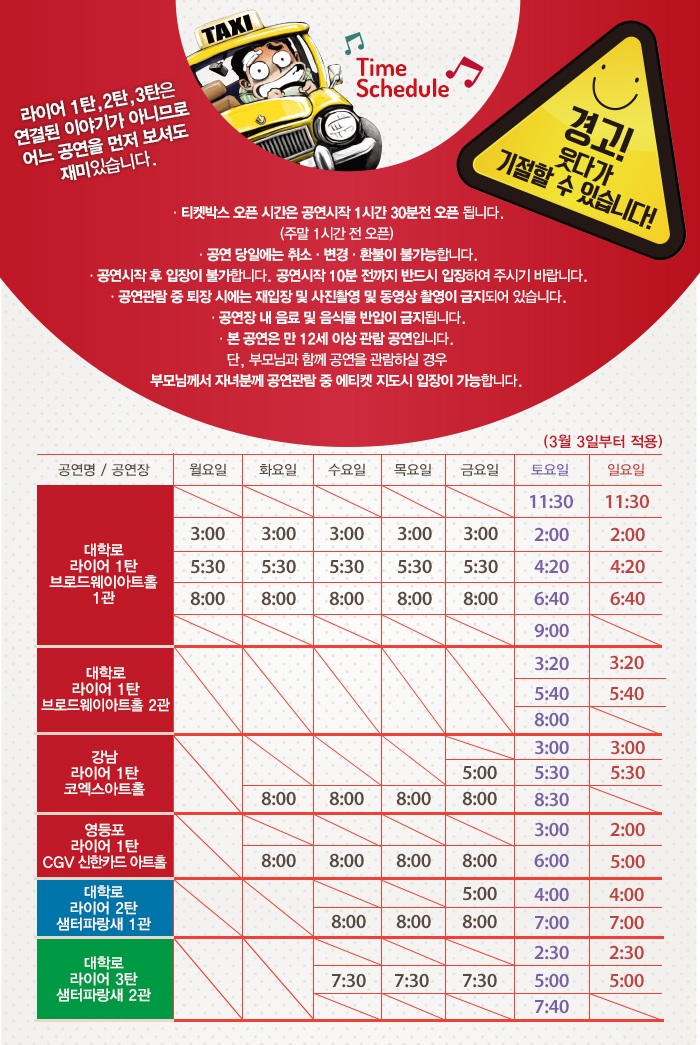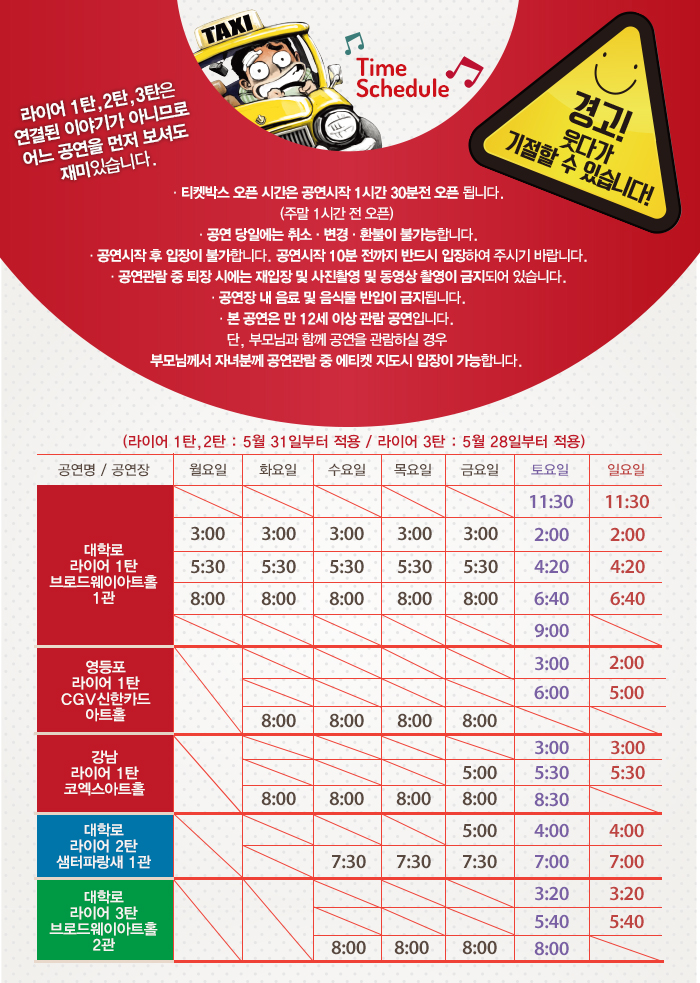 | 공연시간 | 수-금 7:30 / 토 2:30, 5:00, 7:40 / 일(공휴일) 2:30, 5:00 (월-화 공연없음) | ||||||||||||||||||||||||||||||||||||||||||||||||||||||