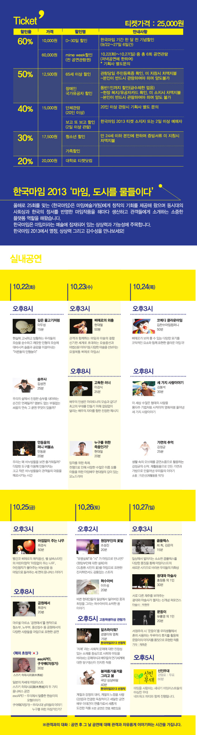 - mime week할인(전 공연 관람권) 60%_10,000원 (02-743-9226~7로 문의)