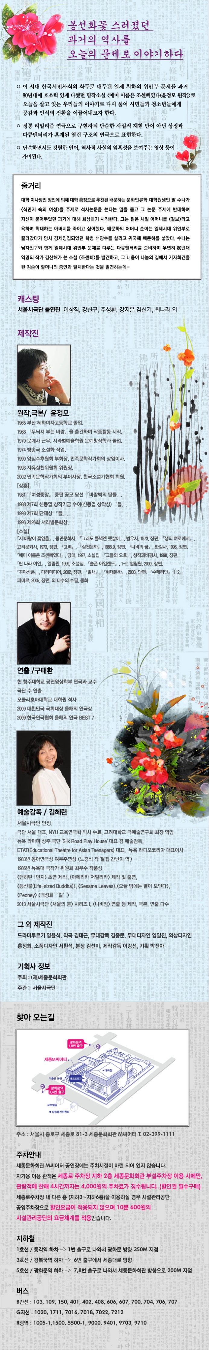 | 제작 | 주최: (재)세종문화회관 주관: 서울시극단 |