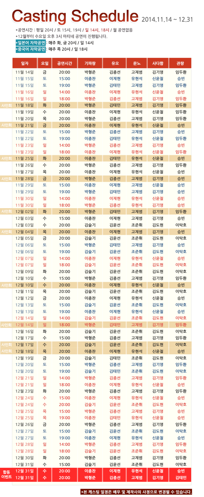 | 공연시간 | 화목금 20:00 수 15:00/20:00 토 15:00/19:00 일 14:00/18:00 | ||||||||||||||||||||||||||||||||||||||||||||||||||||||