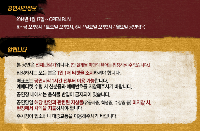 | 공연시간 | 평일(화~금) 8시 / 토 3시, 6시 / 일 3시 / 월요일 공연없음 | ||||||||||||||||||||||||||||||||||||||||||||||||||||||