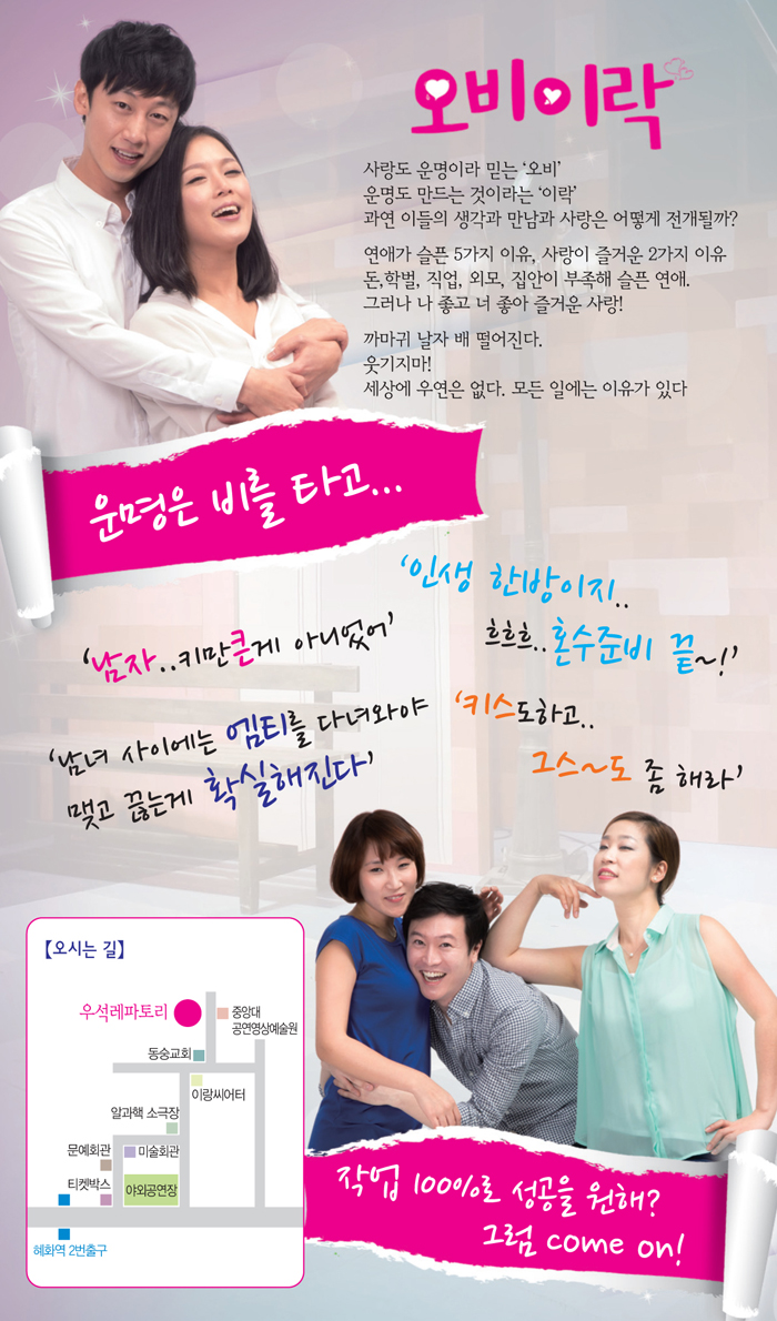 연극은 처음봤는데 재미있네요 연기들도 잘하시고 노래도 너무좋아요~! 여자친구생기면 또보러가고싶다~오비이락 짱짱맨!! | 윤창근 | 2014-03-20 |