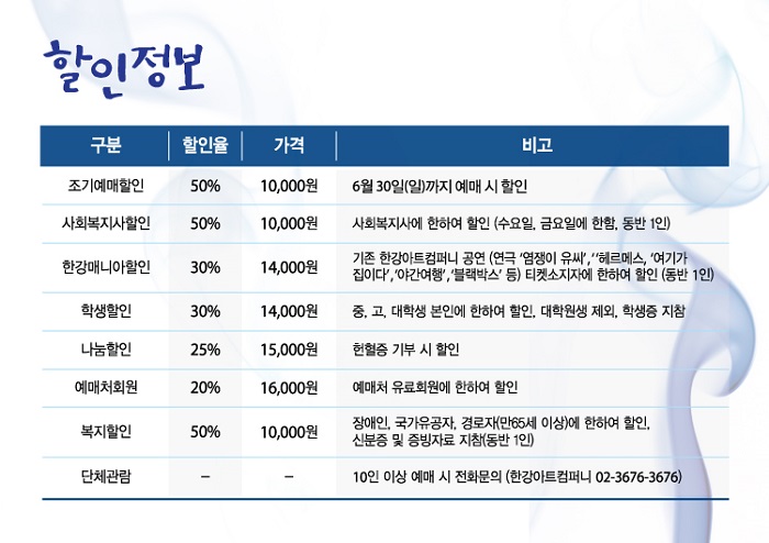 단체관람 : 10인 이상 예매 시 전화문의(한강아트컴퍼니 02-3676-3676)