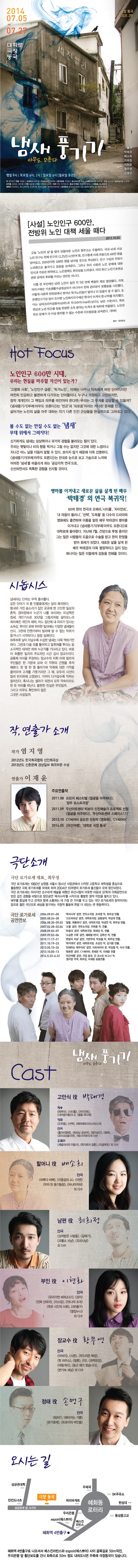 "연극은 사회를 비추는 거울이다." 란 말이 확 와닿네요. 서로 같이 살면서도 서로 관심이 없는 이웃과 그렇게 홀로 고독사를 맞이 한 이웃이 있어도 소문이 날까봐 자기한테 피해가 올까봐 쉬쉬하는 이웃. 정말 안타까운 현실을 보는 것 같습니다. | 이용현 | 2014-07-06 |
