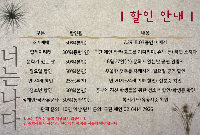 | 할인정보 | 연극인 할인(50%) / 그 외 아래참조 |