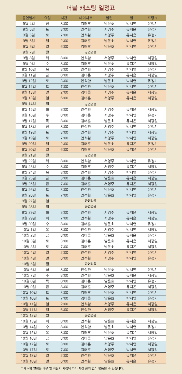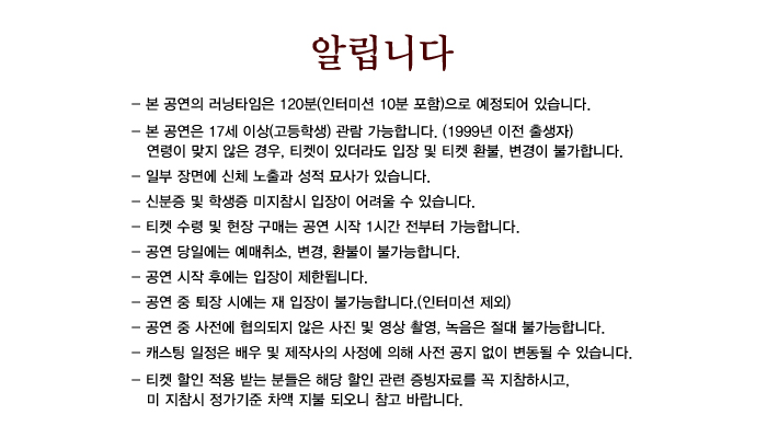 | 공연시간 | 평일 8시│토 3시, 7시│일 2시, 6시│월 쉼 | ||||||||||||||||||||||||||||||||||||||||||||||||||||||