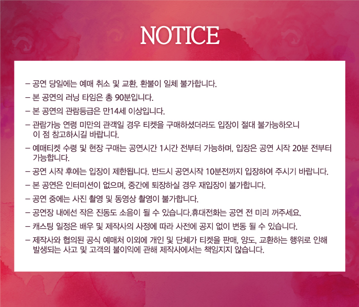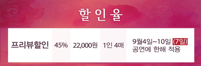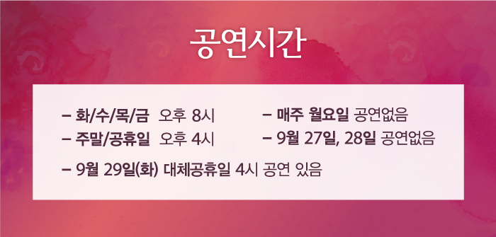 | 공연시간 | 화,수,목,금 : 오후 8시 주말,공휴일: 4시(월요일 공연없음) | ||||||||||||||||||||||||||||||||||||||||||||||||||||||