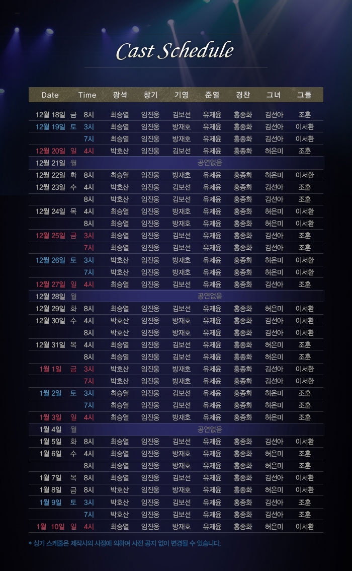 | 공연시간 | 화금20:00 수목 16:00/20:00 토15:00/19:00 일16:00 | ||||||||||||||||||||||||||||||||||||||||||||||||||||||