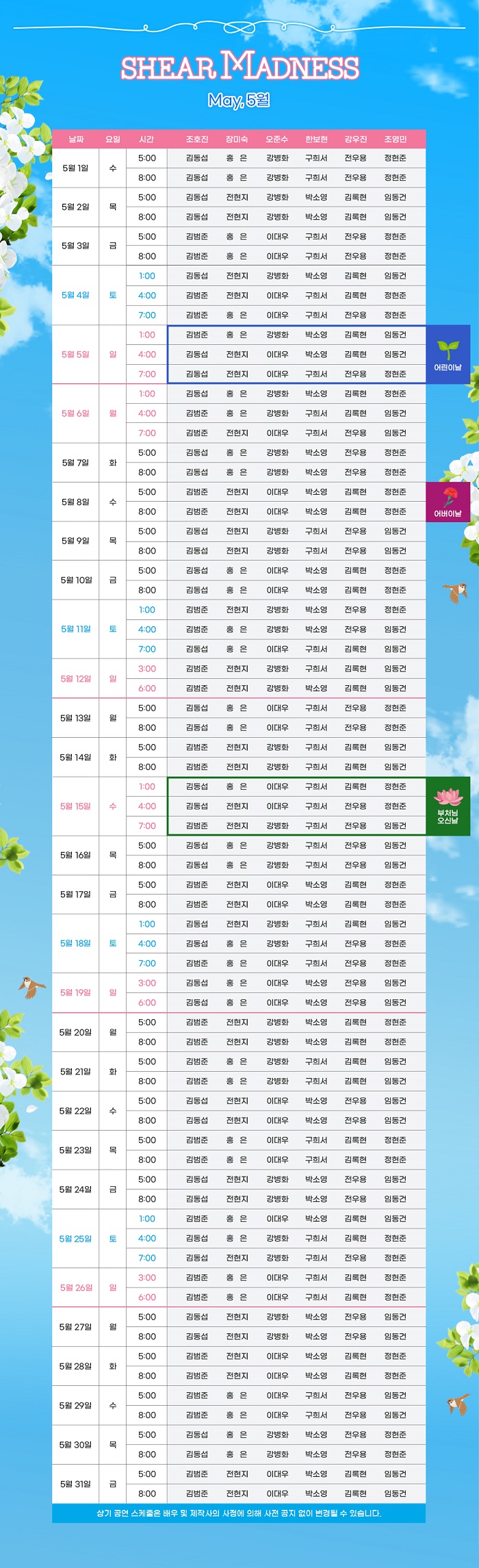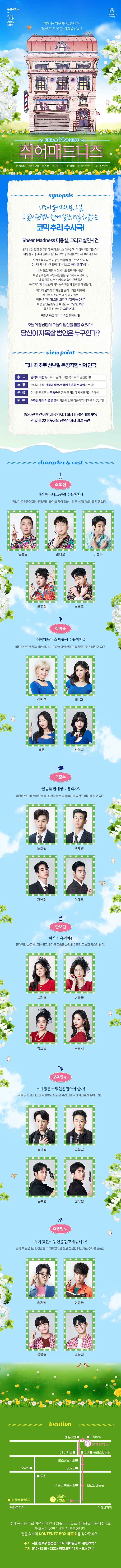 | 공연시간 | 월화수목금 17:00 20:00 / 토 13:00 16:00 19:00 / 일 15:00 18:00 | ||||||||||||||||||||||||||||||||||||||||||||||||||||||