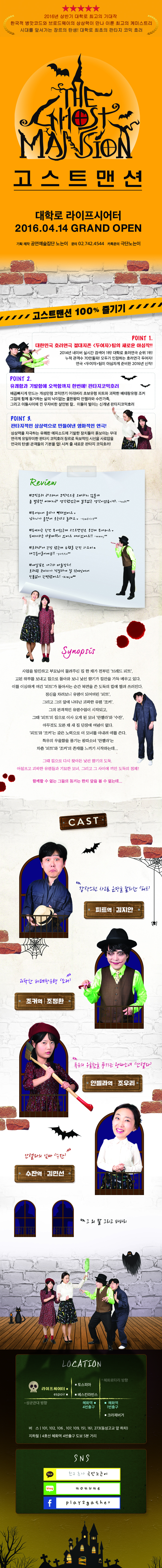 | 공연장르 | 연극(코미디), 연극(호러), [테마] 연인 또는 부부, [테마] 아직은 어색한 커플, [테마] 오랜만에 만난 친구들, [테마] 혼자 보기 좋은 공연, [테마] 퇴근 후 직장인들, [추가분류] 초연 | ||||||||||||||||||||||||||||||||||||||||||||||||||||||