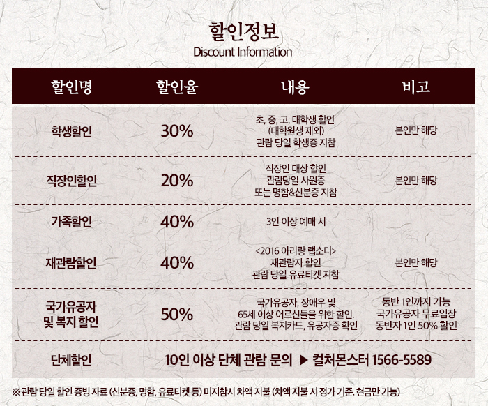| 할인정보 | 학생할인21,000원/ 직장인할인24,000원/ 가족할인18,000원/ 재관람할인18,000원/ 복지 및 국가유공자할인15,000원 |